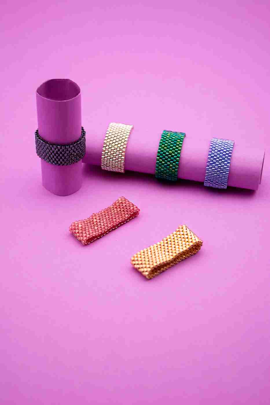 L’anello a fascia Kate è caratterizzato da un ricamo a tessitura a mano, lavorato con centinaia di perline cilindriche in vetro giapponese di alta qualità e con morbido filo di nylon intrecciato e resistente.