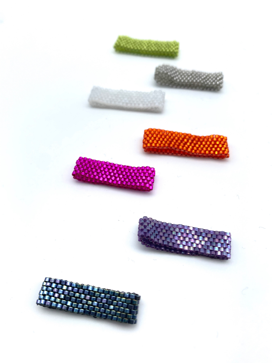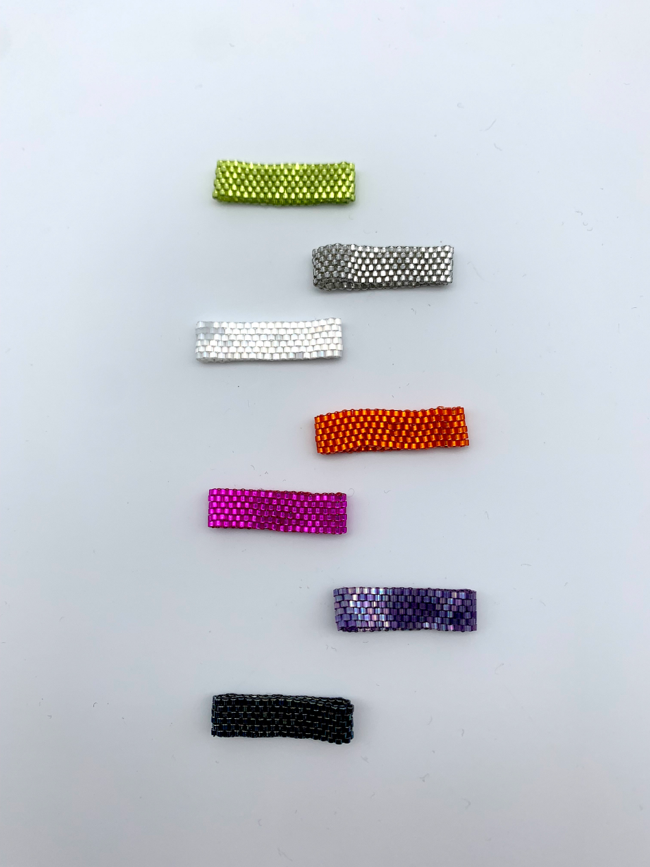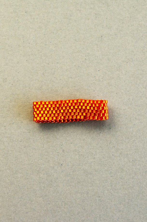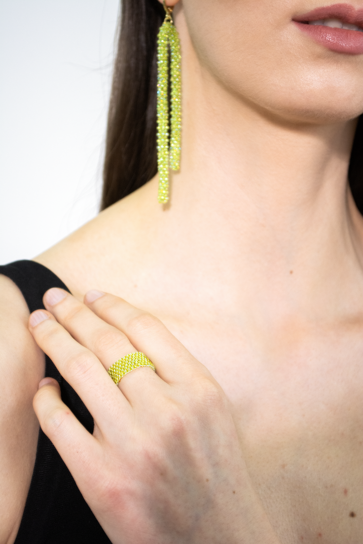 Ogni perlina è ricamata per creare una trama compatta e vibrante, che avvolge il dito.