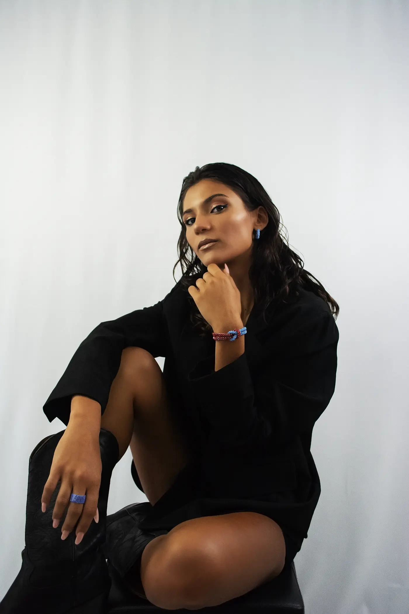 Questo bracciale gioiello unico è stato ricamato interamente a mano con centinaia di perline in vetro giapponese di alta qualità e con morbido filo di nylon intrecciato e resistente, impreziosito da terminali e chiusura in metallo prezioso quali Bronzo color oro o in Argento 925 lavorati a mano e lucidati.