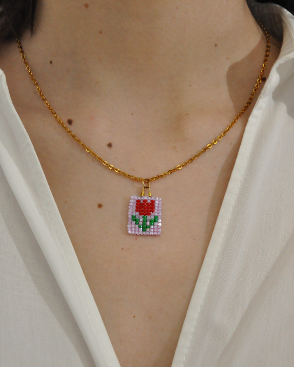La collana Candy Cane è composta da un ciondolo a forma di bastoncino di zucchero con perline in vetro giapponese ricamate a mano e una catenina.