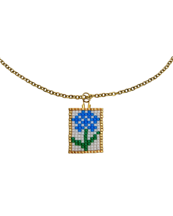 La collana Gift è composta da un ciondolo ricamato interamente a mano con perline in vetro giapponese e da una catenina in acciaio, disponibile in due varianti di metallo: Acciaio color Oro e Acciaio.