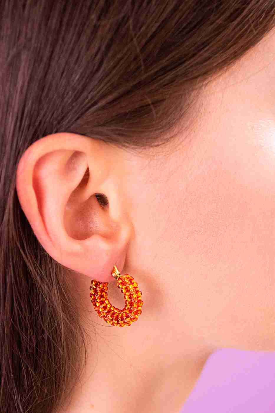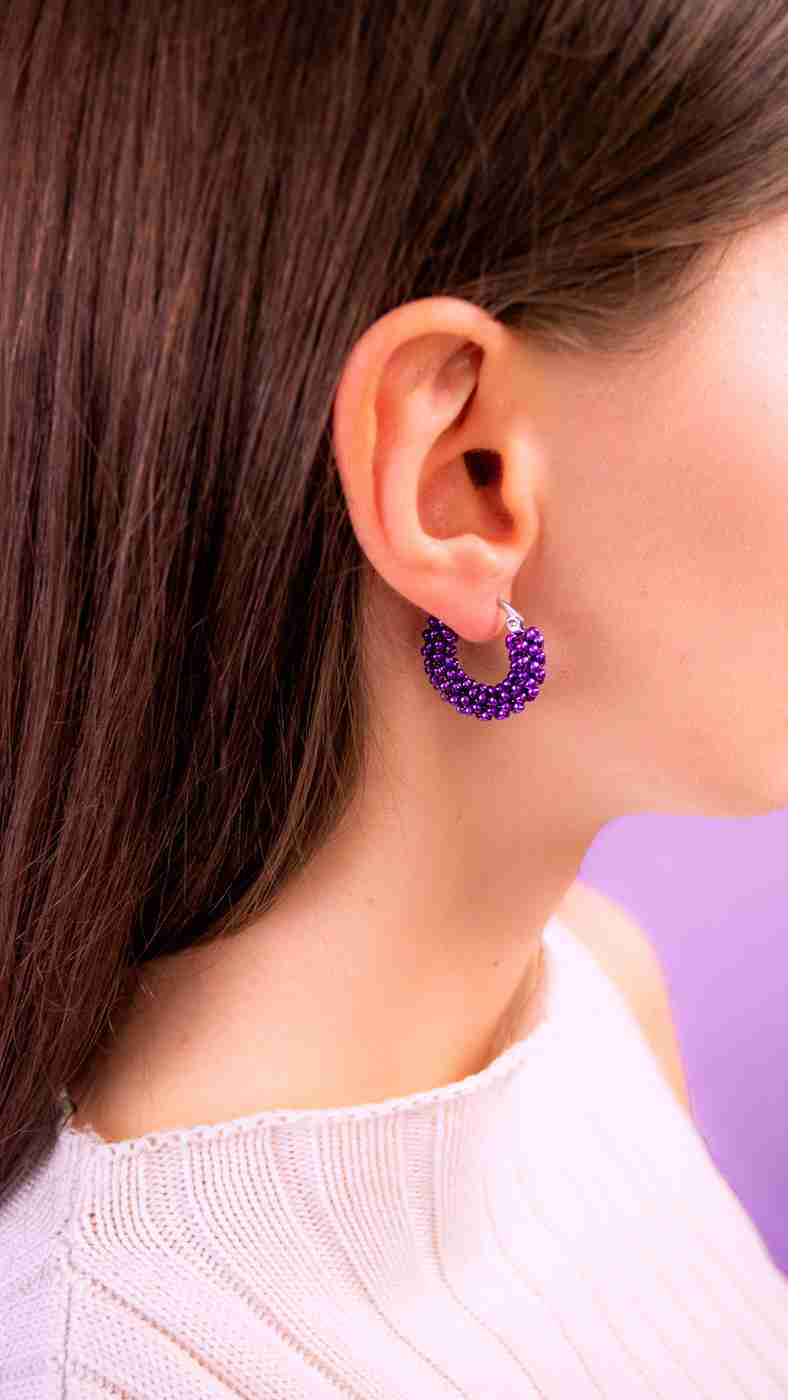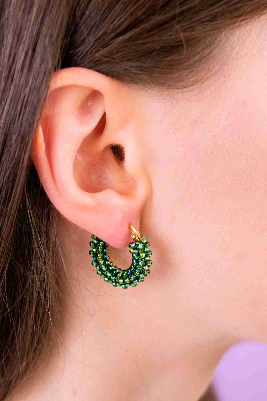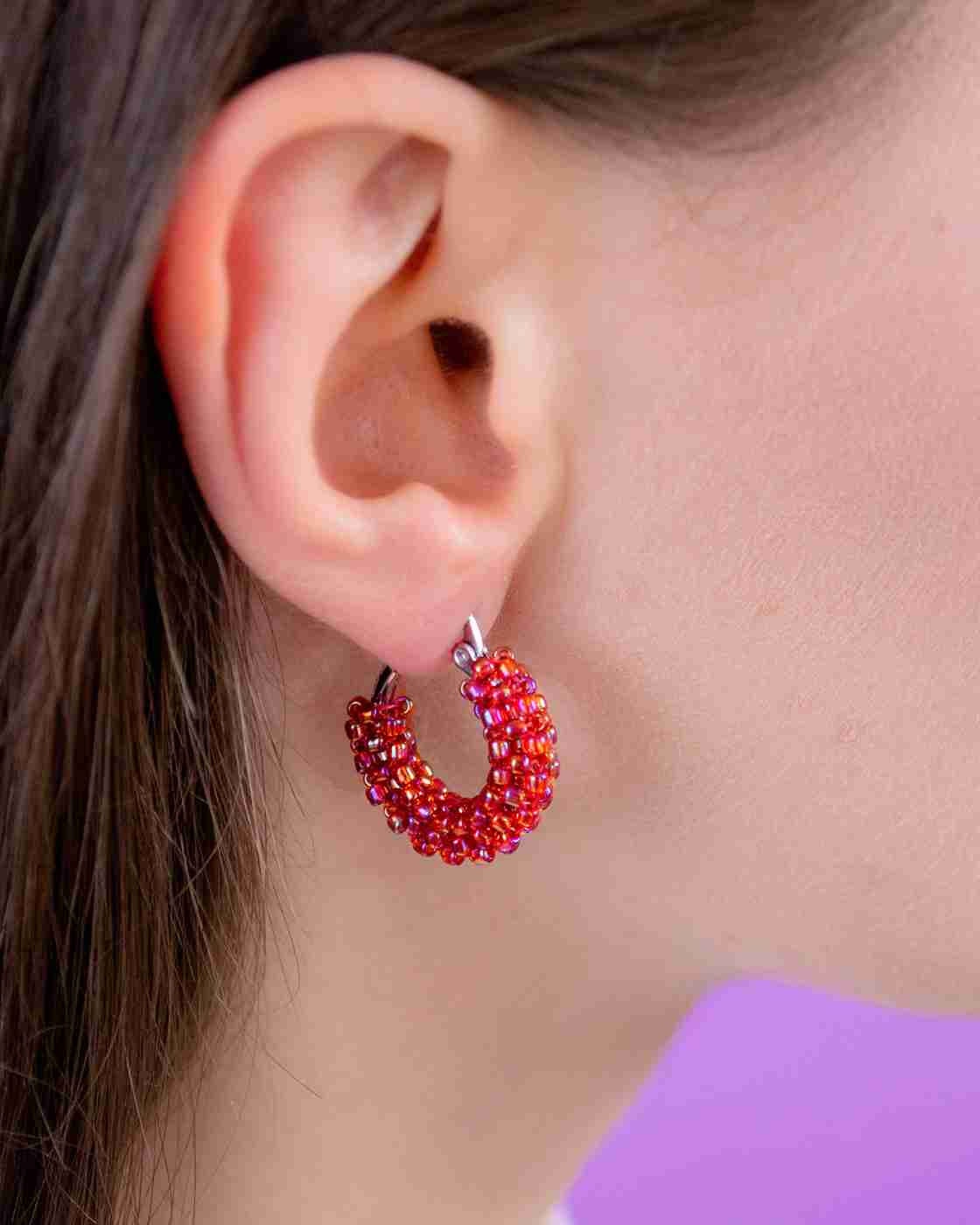 Gli orecchini a cerchio sono ricamati a mano con centinaia di perline tonde in vetro giapponese di alta qualità e con morbido filo di nylon intrecciato e resistente intorno ad una base in acciaio.