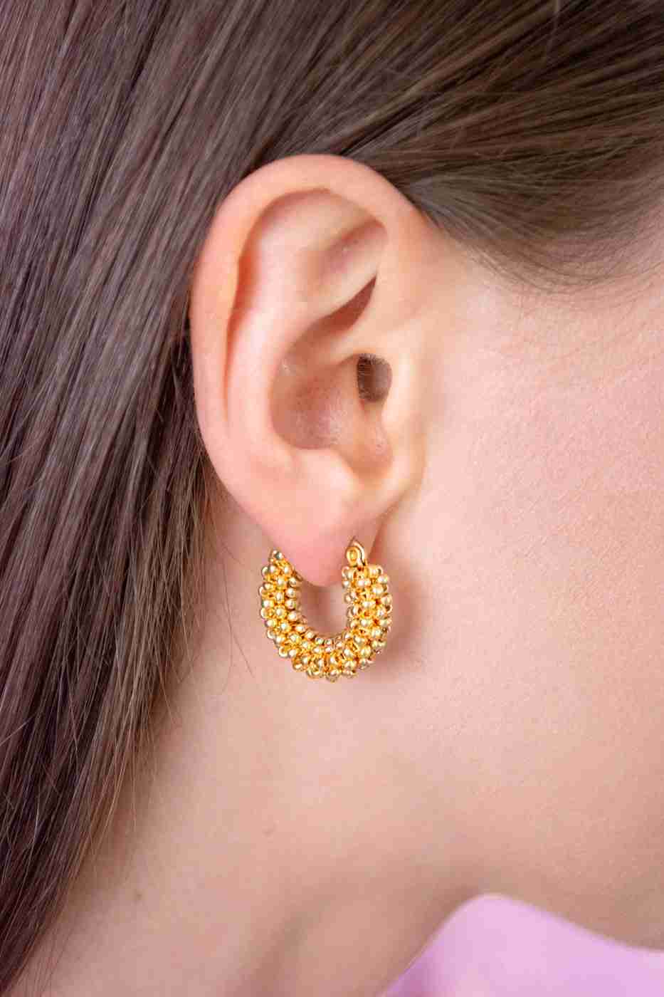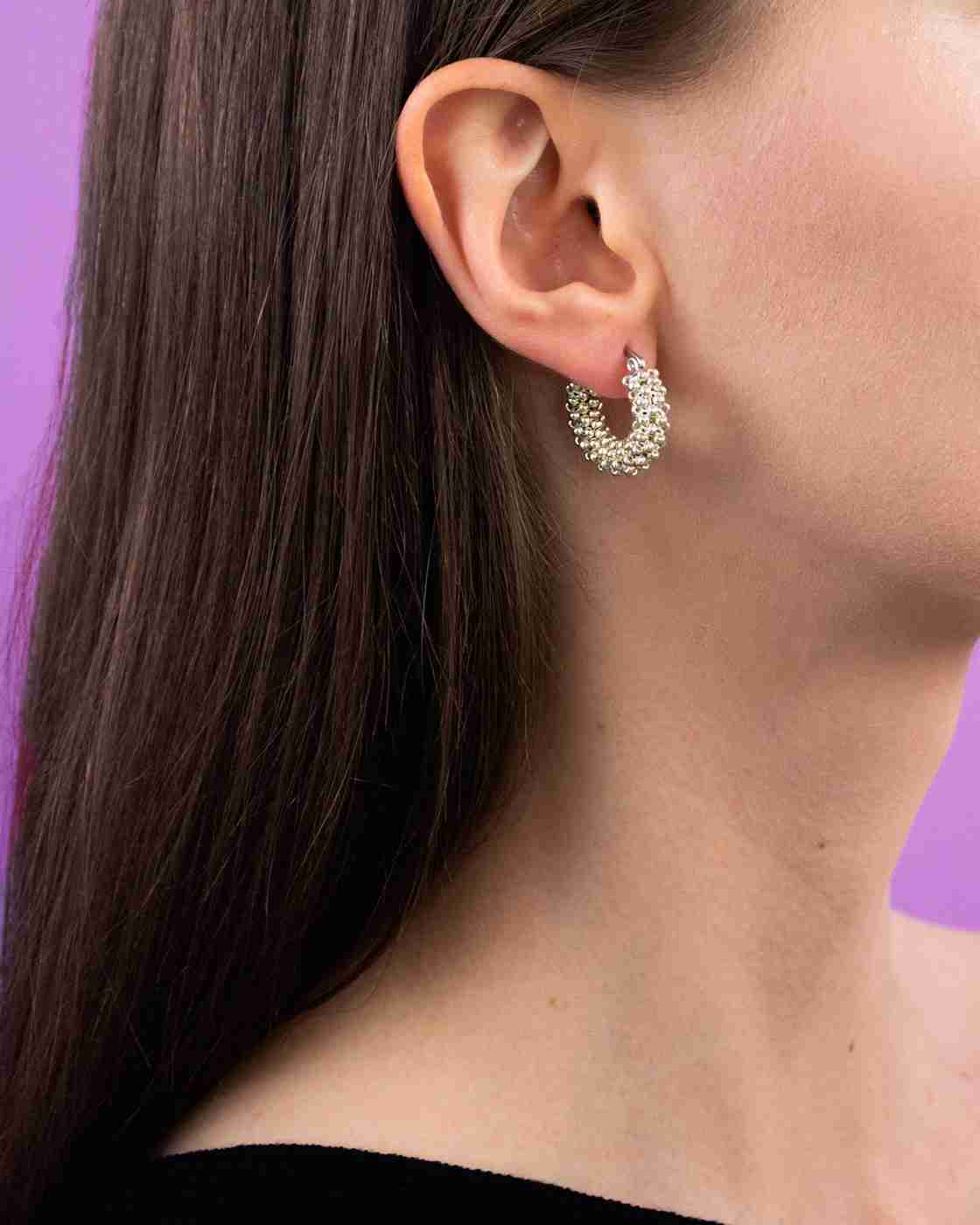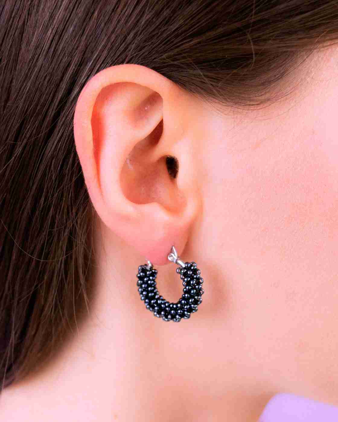 Gli orecchini a cerchio sono ricamati a mano con centinaia di perline tonde in vetro giapponese di alta qualità e con morbido filo di nylon intrecciato e resistente intorno ad una base in acciaio.